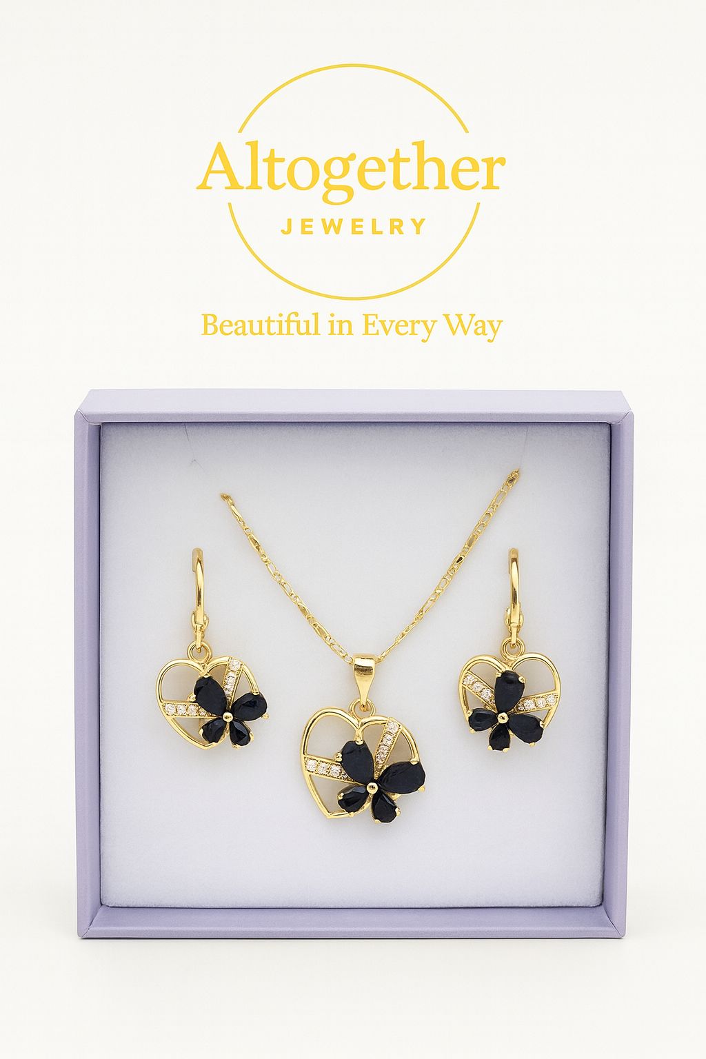 Noir Elegance 18K Set Discover timeless sophistication with this exquisite jewelry collection. Crafted from brass with authentic 18K gold plating, each piece showcases faceted black stones that radiate elegance and inner strength. The set features a delicate necklace and heart-shaped earrings adorned with subtle floral motifs, enhanced by sparkling zirconia accents. This refined combination of classic design and contemporary details makes it an ideal choice for those seeking versatile luxury that transitions seamlessly from everyday wear to special occasions. A statement of understated elegance.